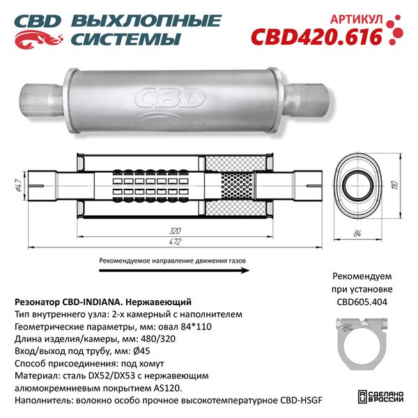 CBD420.616 CBD Резонатор универсальный d=84,L=480мм (внешн. d=110мм) под трубу 45мм нержавеющая