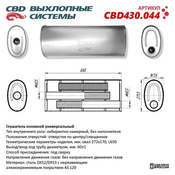 CBD430.044 CBD Глушитель универсальный овальный d=272х170мм L=650 (отверстия с разных сторон по
