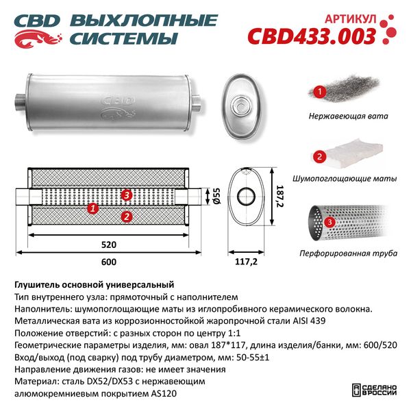 CBD433.003 CBD Глушитель универсальный овальный d=187х117мм L=598/520 прямоточный под трубу 50-