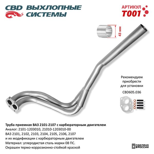 T001 CBD Труба приемная глушителя ВАЗ-2101,2102,2103,2104,2105,2106,2107 CBD
