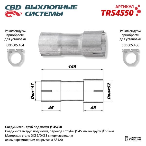 TRS4550 CBD Соединитель труб выхлопной системы (переход с d=45мм на d=50мм) под хомут CBD