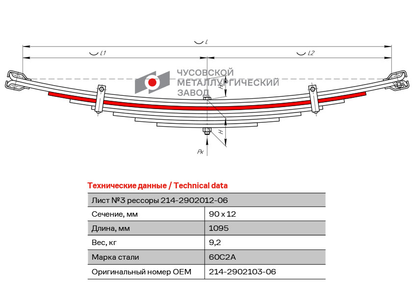 214290210306 OMK AUTO Лист рессоры КРАЗ-214 передней №3 L=1095мм ЧМЗ