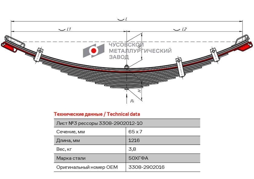 | Наименование | Лист рессоры ГАЗ-3308,33081 передней №3 с чашками L=1216мм ЧМЗ |
