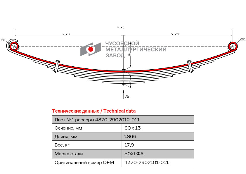 43702902101011 OMK AUTO Лист рессоры МАЗ-4370 передней №1 (8 листов) L=1866мм ЧМЗ