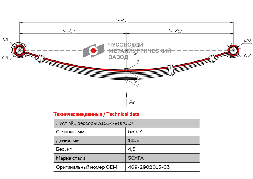 | Наименование | Лист рессоры УАЗ-469 передней №1 L=1100мм ЧМЗ |