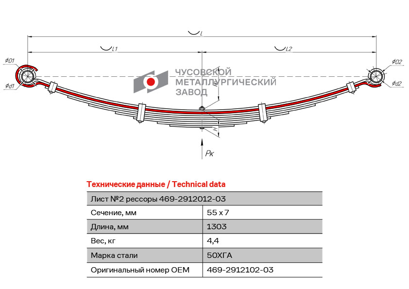 469-2912102-03 OMK AUTO Лист рессоры УАЗ-469 задней №2 L=1250мм ЧМЗ