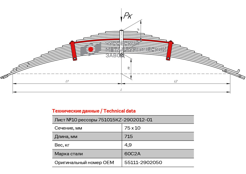 551112902050 OMK AUTO Лист рессоры КАМАЗ-4408,53215,54115,55111,6350 передней №10 с хомутами L=715мм Ч