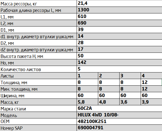 | Наименование | Рессора TOYOTA Hilux (04-15) (4WD) (Kun25/26) задняя (5 листов) L=1300мм ЧМЗ SPR |