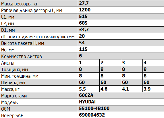 | Наименование | Рессора HYUNDAI Porter 1,H-100 задняя (6 листов) без сайлентблоков L=1230мм ЧМЗ |