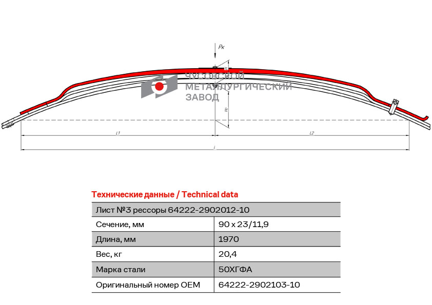 | Наименование | Лист рессоры МАЗ-64222 передней №3 (3-х листовой) L=2000мм ЧМЗ |