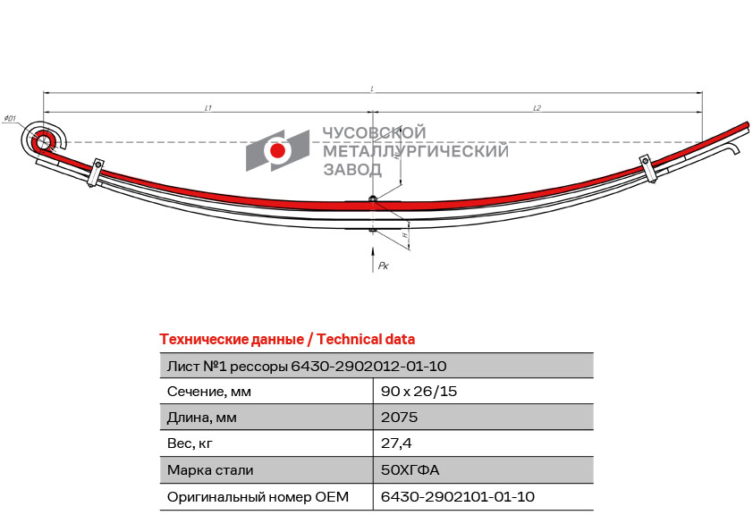 | Наименование | Лист рессоры МАЗ-6430 передней №1 L=2075мм ЧМЗ |