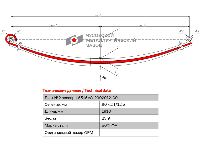 | Наименование | Лист рессоры МАЗ-6516,6430С передней №2 с витым ушком L=1910мм ЧМЗ |