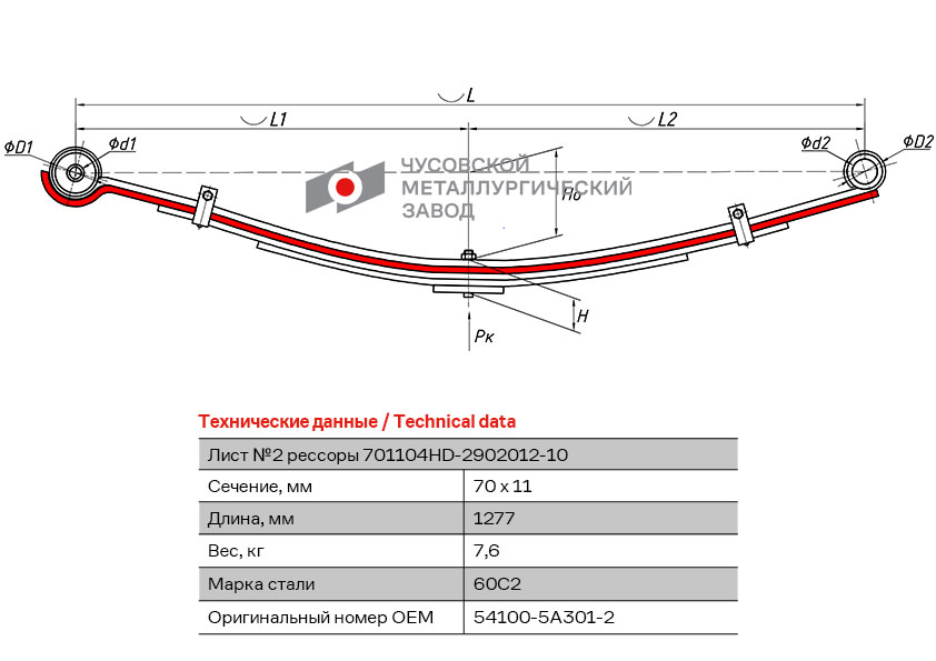 701104HD2902102 OMK AUTO Лист рессоры HYUNDAI County передней №2 (5 листов) с укороченным ушком L=1277мм