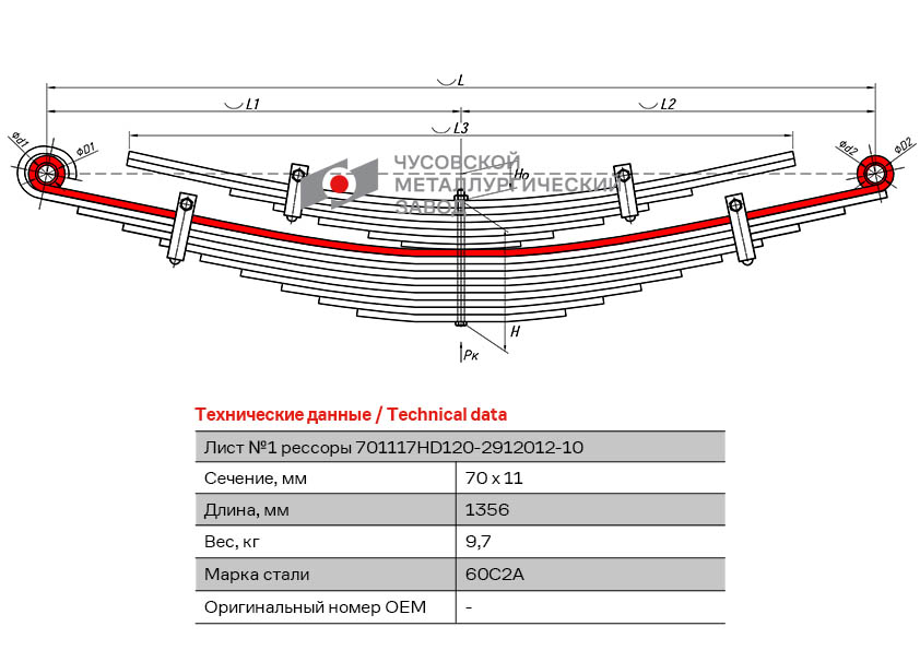 701117HD120291210110 OMK AUTO Лист рессоры HYUNDAI HD 120 задней №1 (17 листов) L=1356мм ЧМЗ