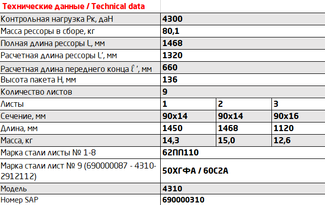 | Наименование | Рессора КАМАЗ-4310,43114 задняя (9 листов) L=1450мм ЧМЗ |