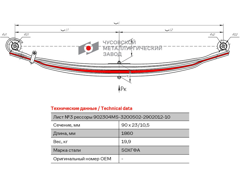 902304MS32005022902103 OMK AUTO лист рессоры! №3 передняя L1860мм (4-х листовая)\ MB Actros 4140-4148