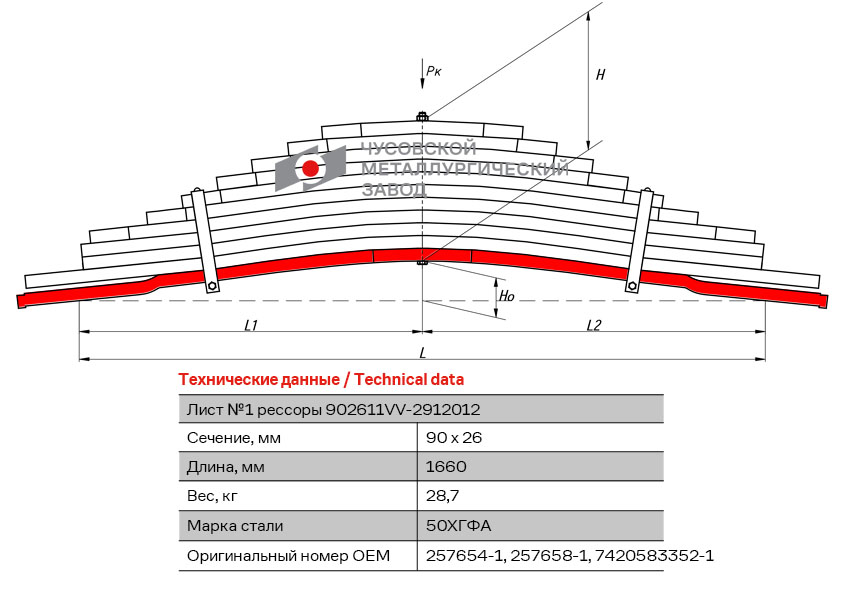 902611VV-2912101 OMK AUTO Лист рессоры VOLVO FH12,FM12,FM10 задней №1 (11 листов) L=1660мм ЧМЗ