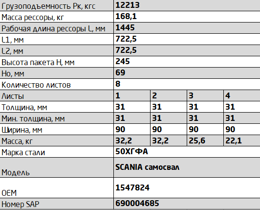 | Наименование | Рессора SCANIA Series R (04-) задняя (8 листов) усиленная L=1590мм ЧМЗ SPRINGER |