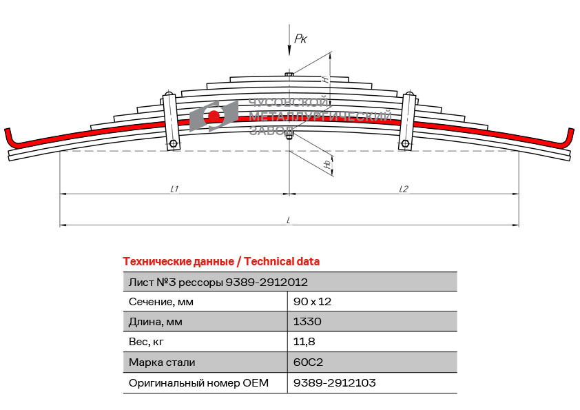 93892912103 OMK AUTO Лист №3 задней рессоры МАЗ (прицепа СЗАП) 1330х90х12 (Чусовой)