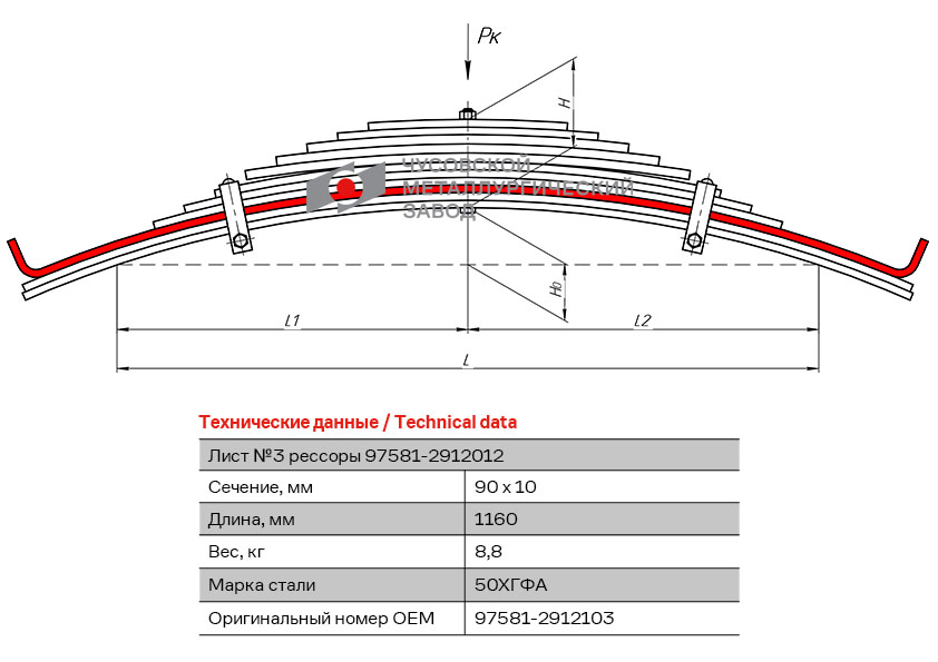 975812912103 OMK AUTO Лист №3 задней рессоры МАЗ (прицепа СЗАП) 1160 (Чусовой)