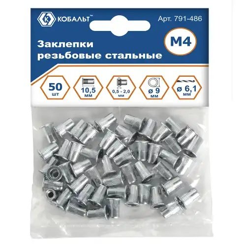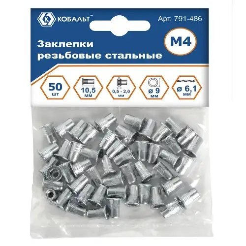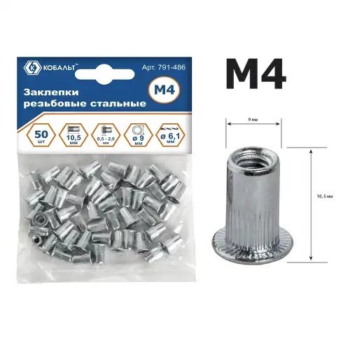 | Наименование | Заклепка резьбовая M4х10.5мм стальная 50шт. КОБАЛЬТ |