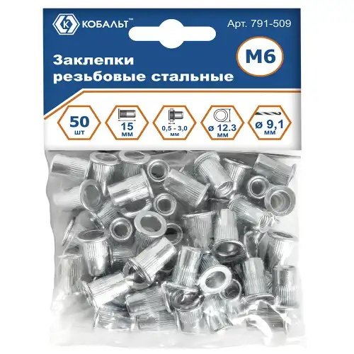 | Наименование | Заклепка резьбовая M6х15.5мм стальная 50шт. КОБАЛЬТ |