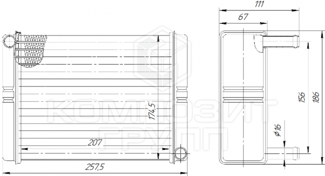 1221810106016 KOMPOZIT 1221.8101060-16 Радиатор 1221.8101060-16 (медно-латунный) отопителя универсальны