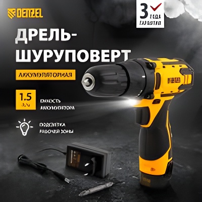 | Наименование | Дрель-шуруповерт аккумуляторный 12.0В (1АКБ Li-Ion) DENZEL |