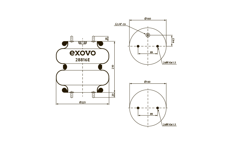 28816E EXOVO пневмоподушка! верх:2отв.M10 1отв-шт.G1/4, низ:2отв.М10\ DAF, ROR, VOLVO