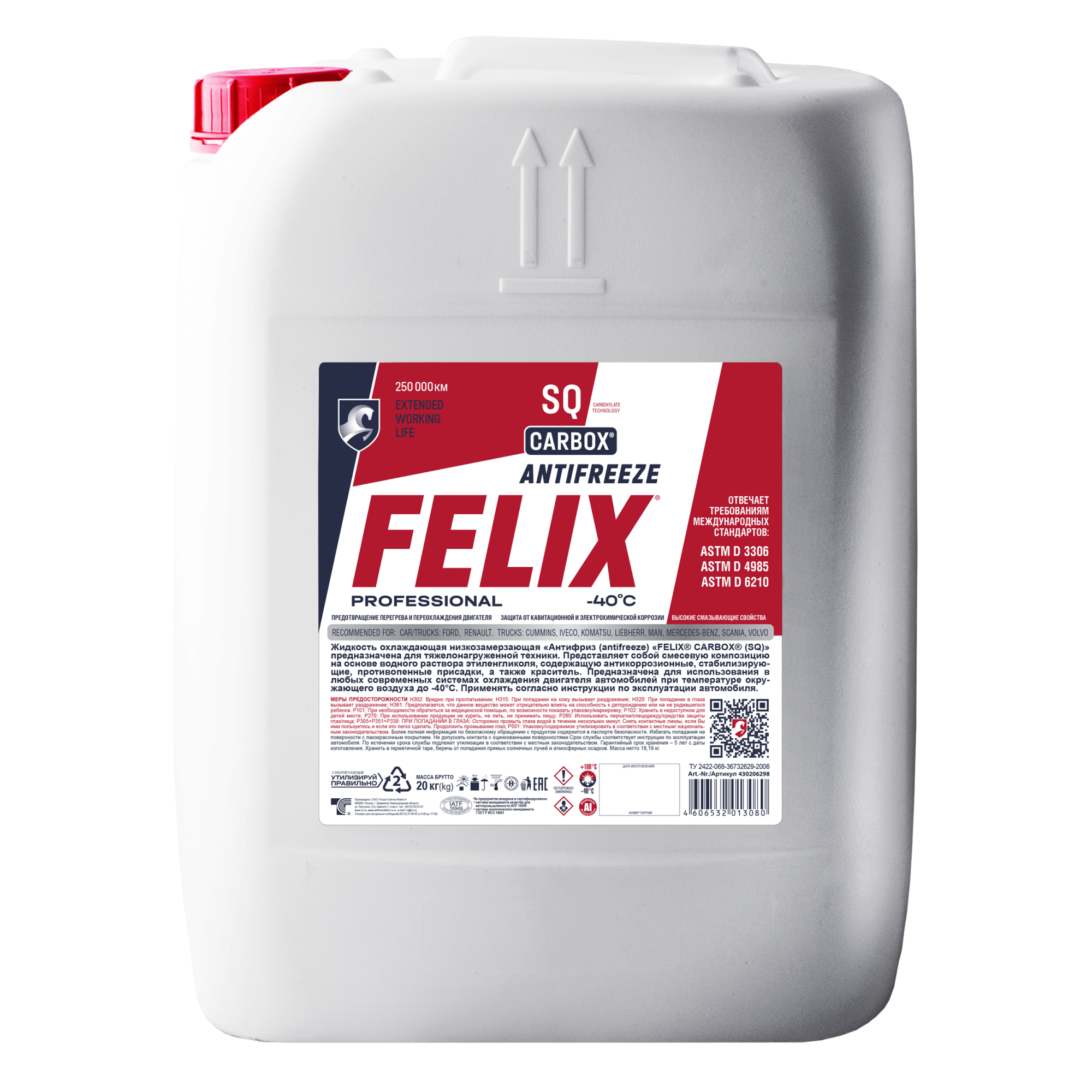 430206298 FELIX Антифриз 20kg Carbox SQ готовый красный, ASTM D 6210, ASTM D 4985, SAE J 1034; I