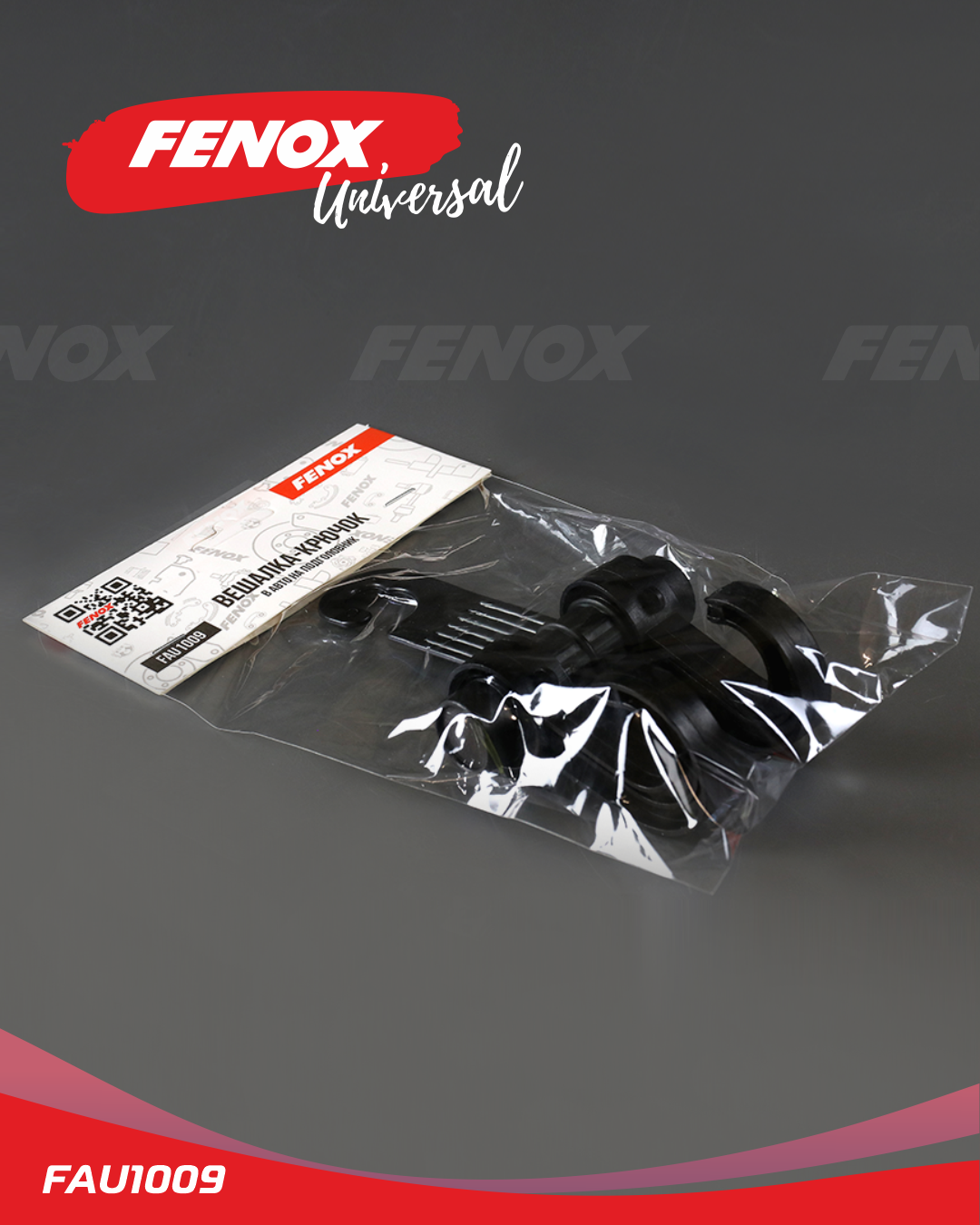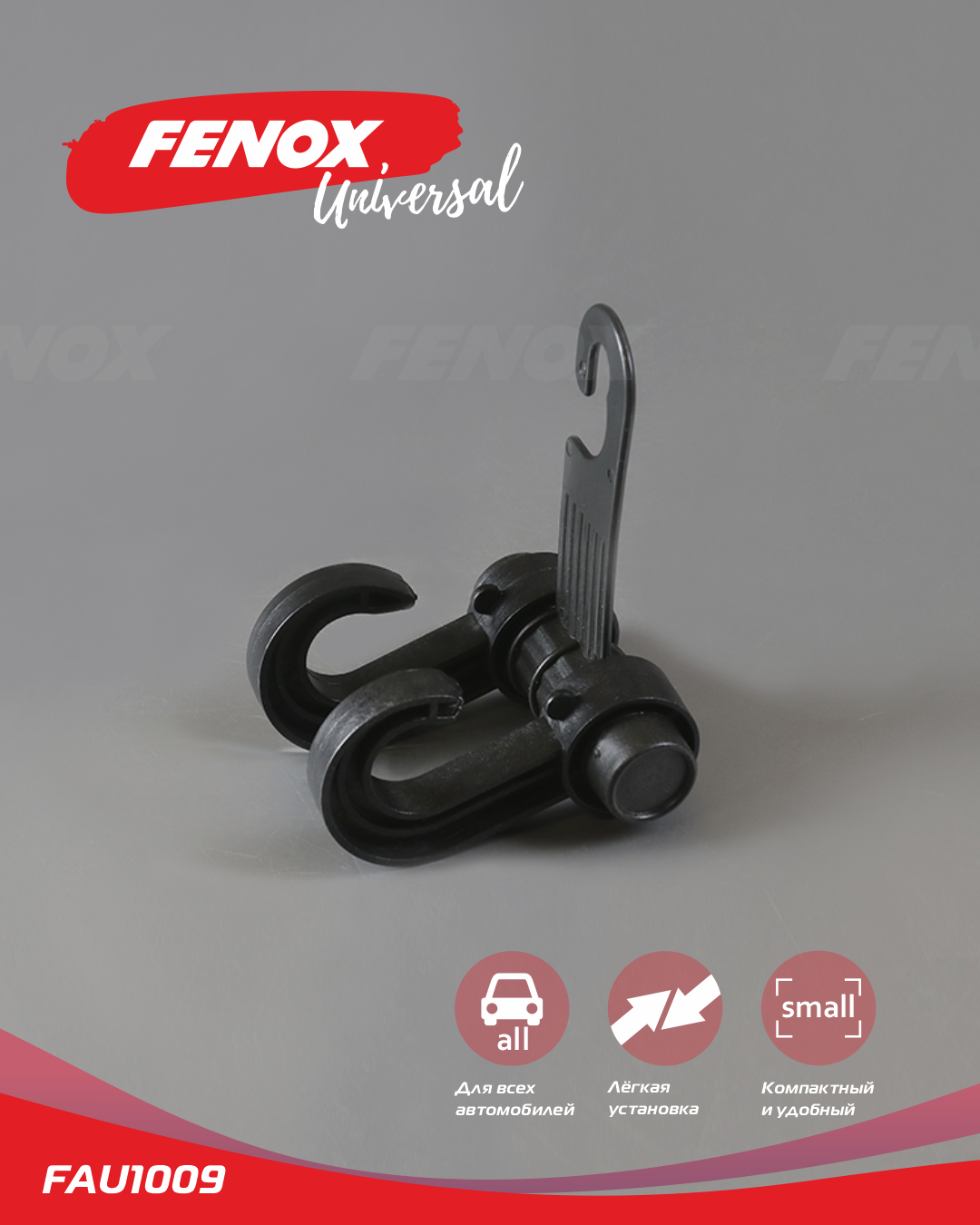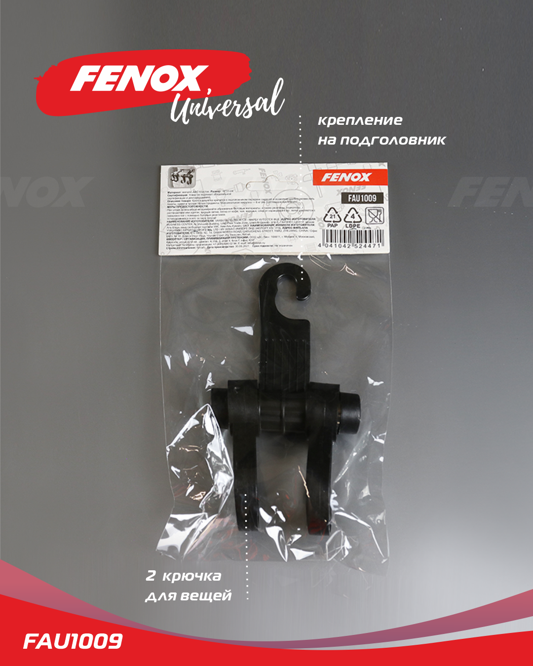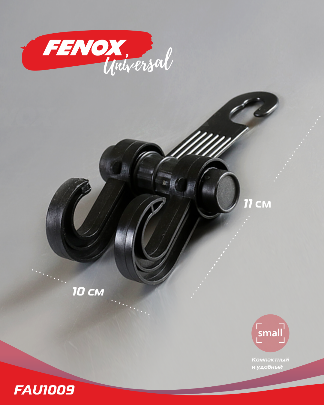 FAU1009 FENOX Вешалка-крючок в авто на подголовник с крючком, черный 10*11 см FAU1009