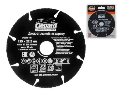 | Наименование | Круг отрезной по дереву 125х22мм для УШМ GEPARD |
