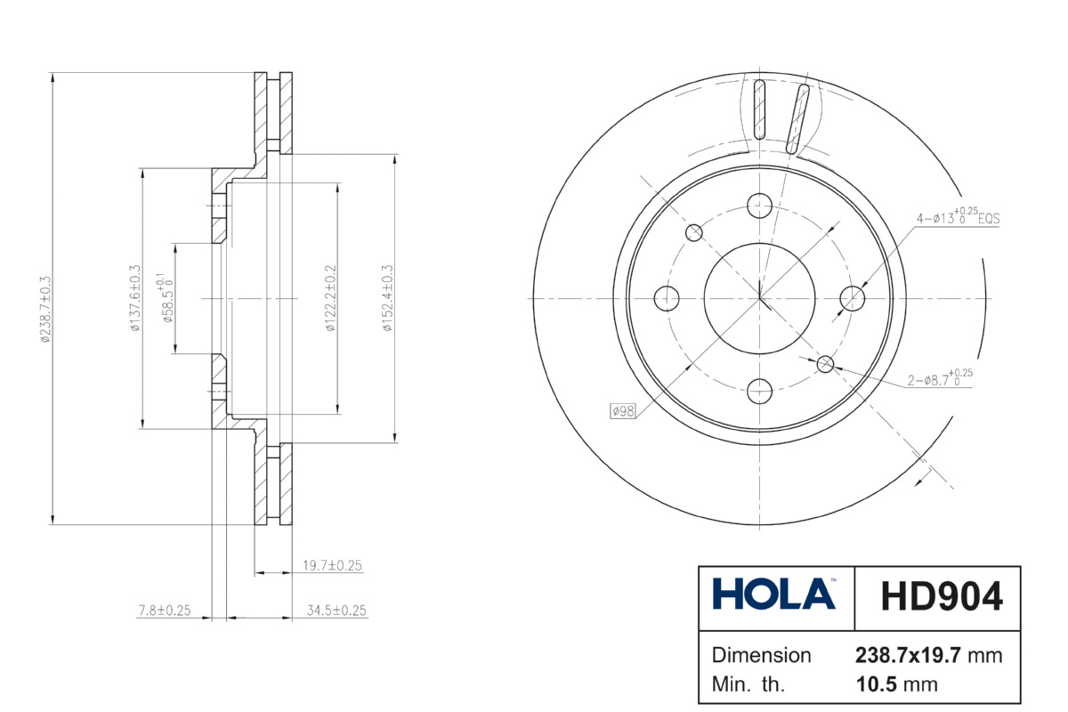 HD904 HOLA Диск тормозной для а/м ВАЗ 2110 (R-13) вентилируемый "HOLA" 2шт