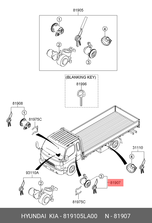 819105LA00 HYUNDAI KIA Личинка HYUNDAI HD65,78 (07-) замка двери левой с ключом OE