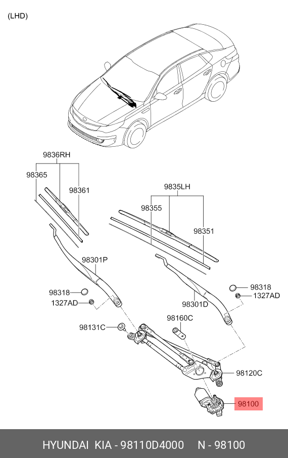 98110D4000 HYUNDAI KIA Мотор-редуктор стеклоочистителя KIA Optima (16-) переднего OE