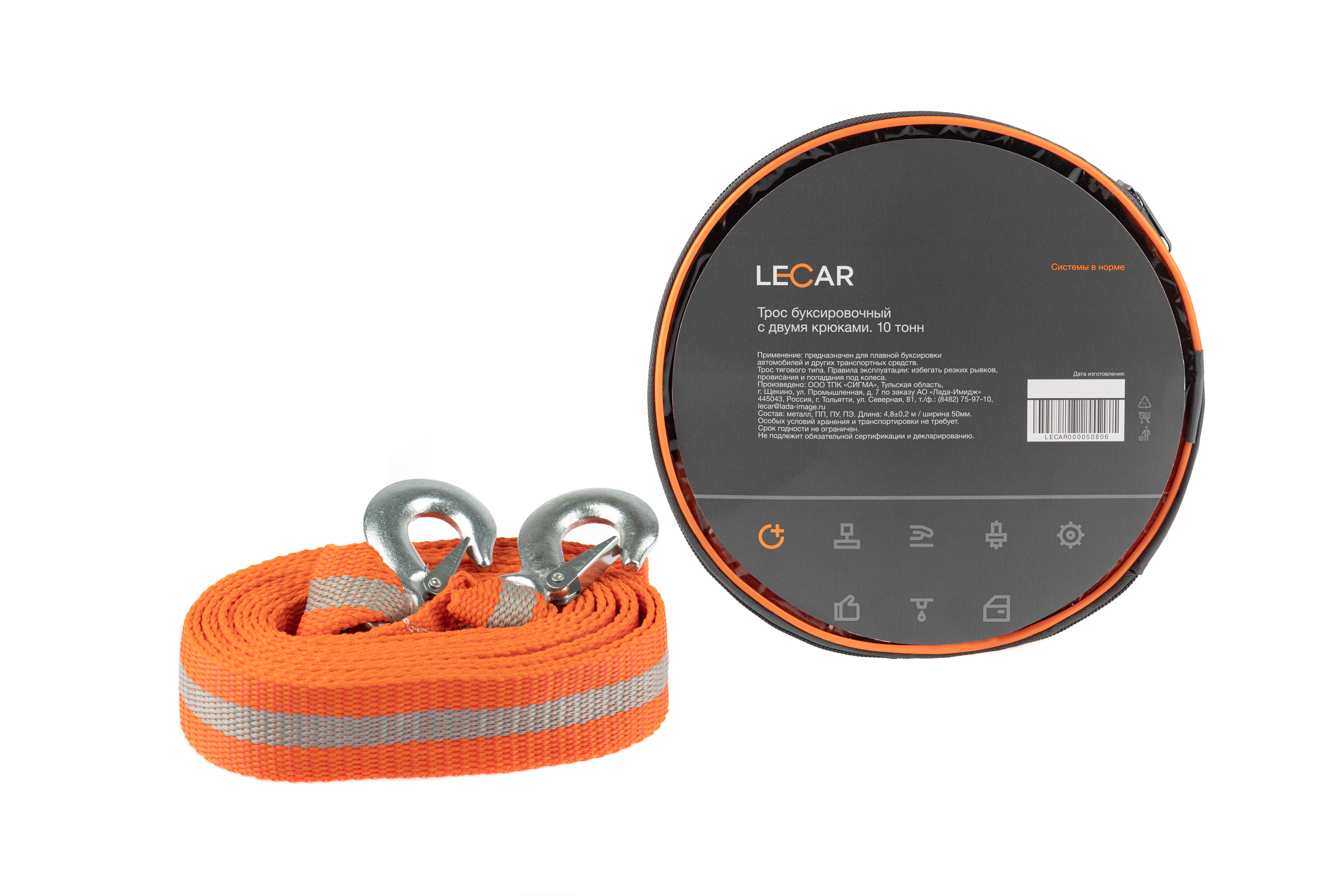LECAR000050806 LECAR Трос буксировочный 10т, 2 крюка, ширина ленты 50мм, 5м, сумка