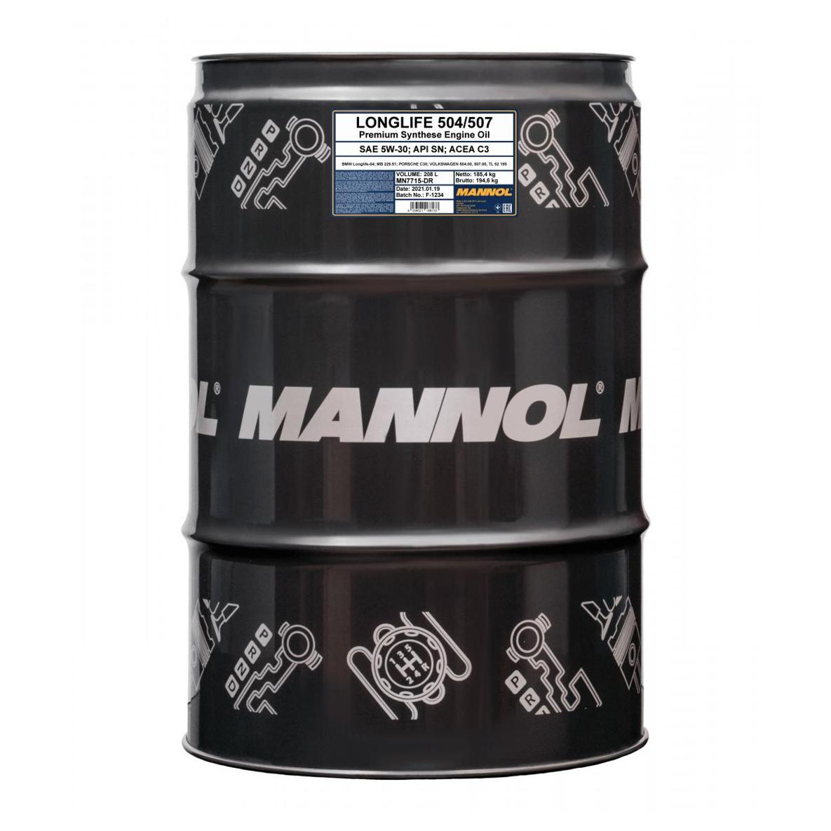 | Наименование | Масло моторное MANNOL Longlife 504/507 7715 5W-30 SN C3 синтетическое 208 л (VW, |