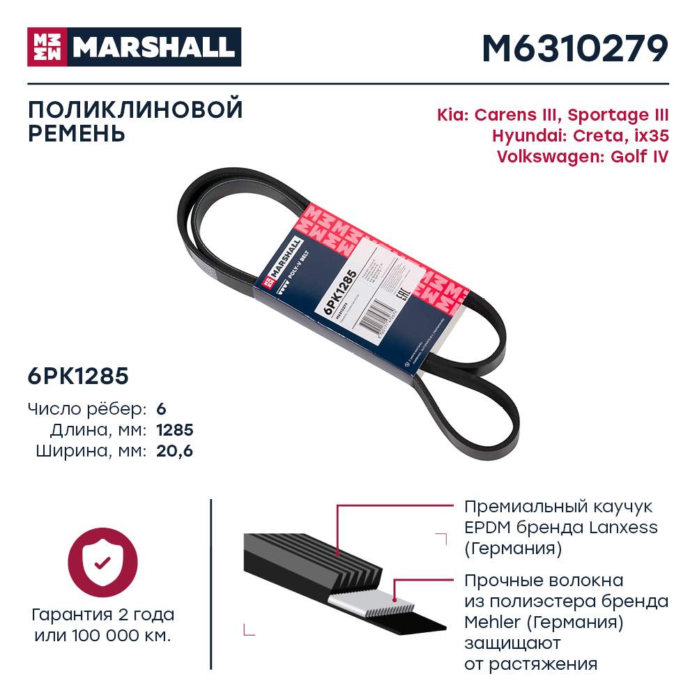 M6310279 MARSHALL Ремень поликлиновой 6PK1285 Hyundai Creta 16- ix35 09- Kia Carens III 13- Spor