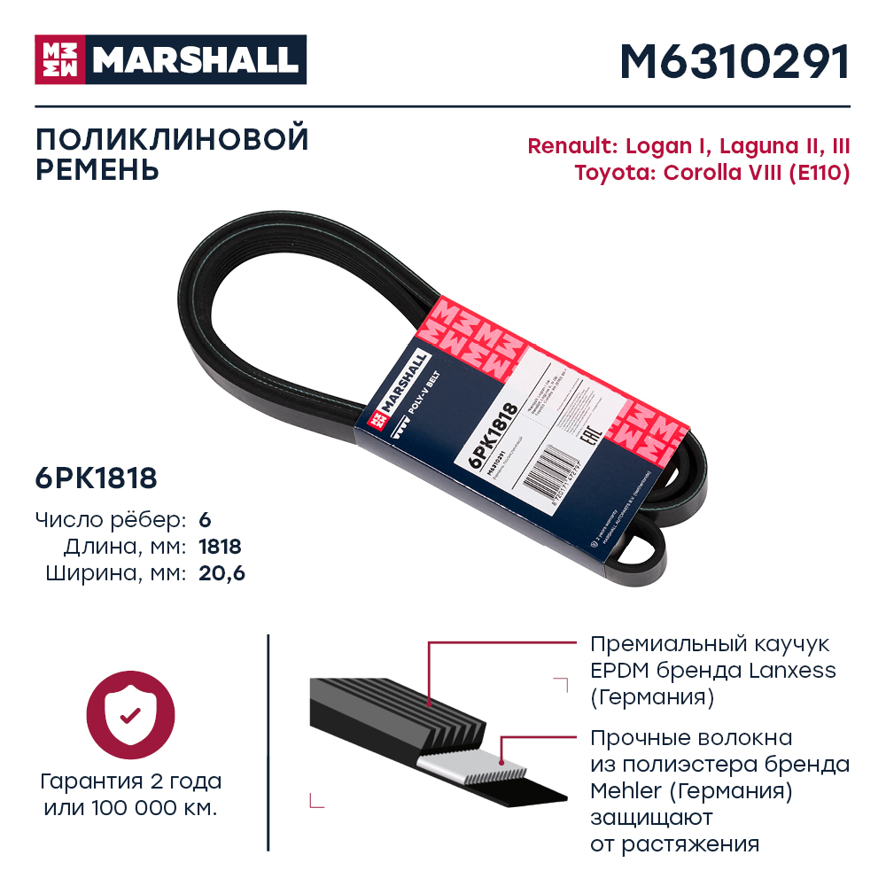 M6310291 MARSHALL Ремень поликлиновой 6PK1818 Renault Logan I 04- Laguna II III 05- Toyota Coroll