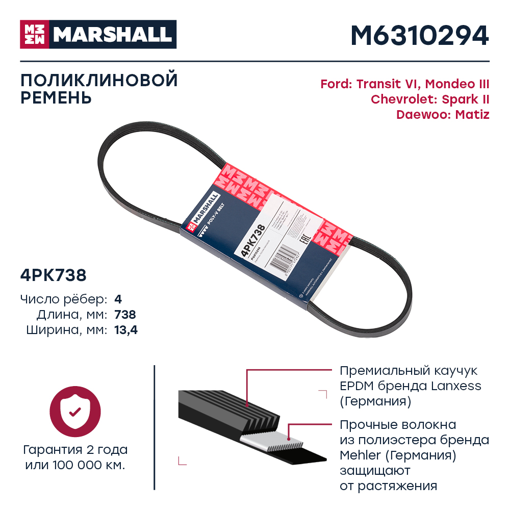 M6310294 MARSHALL Ремень поликлиновой 4PK738 Ford Transit VI 00- Chevrolet Spark II 05- Daewoo Mat