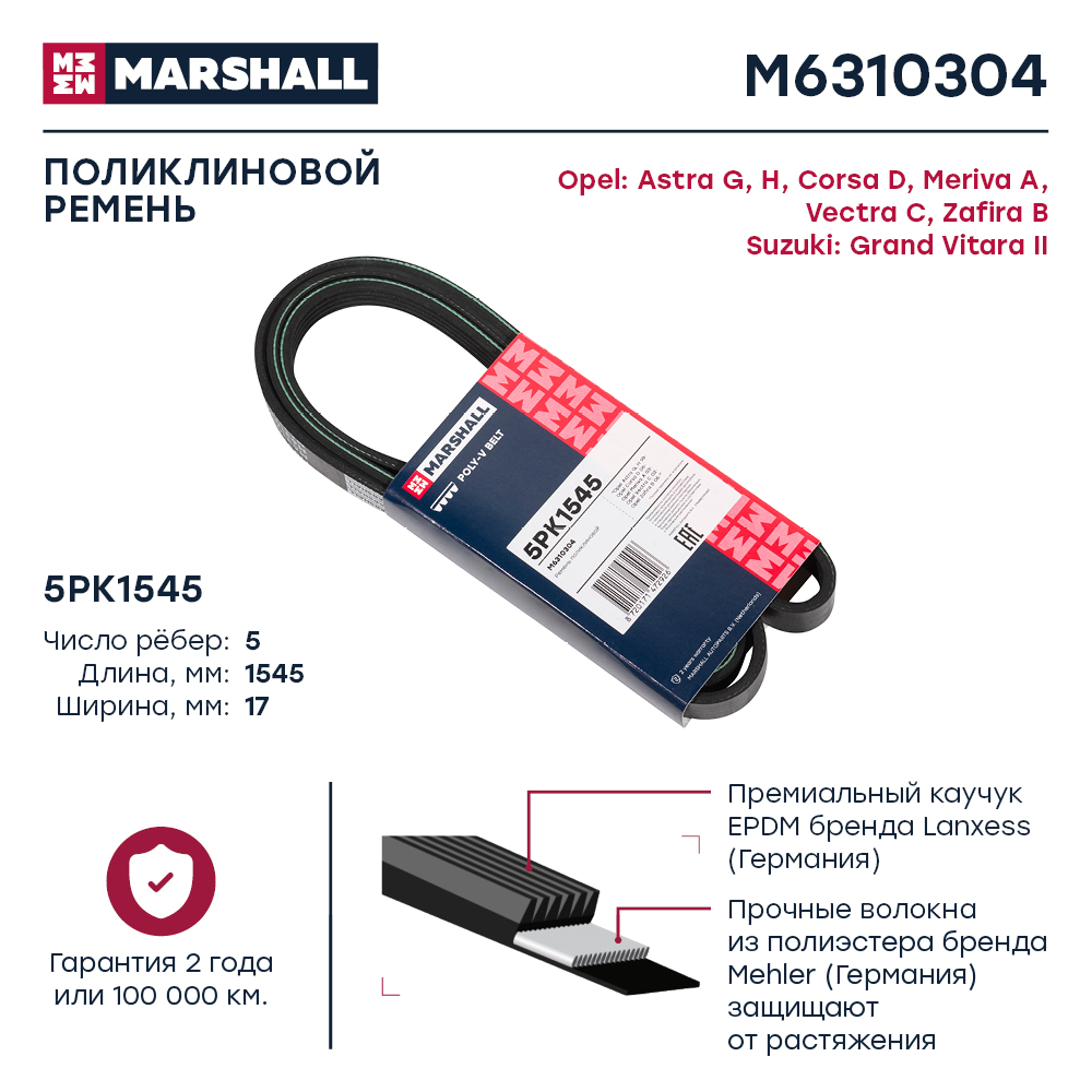 M6310304 MARSHALL Ремень поликлиновой 5PK1545 Opel Astra G H 98- Corsa D 06- Meriva A 03- Vectr