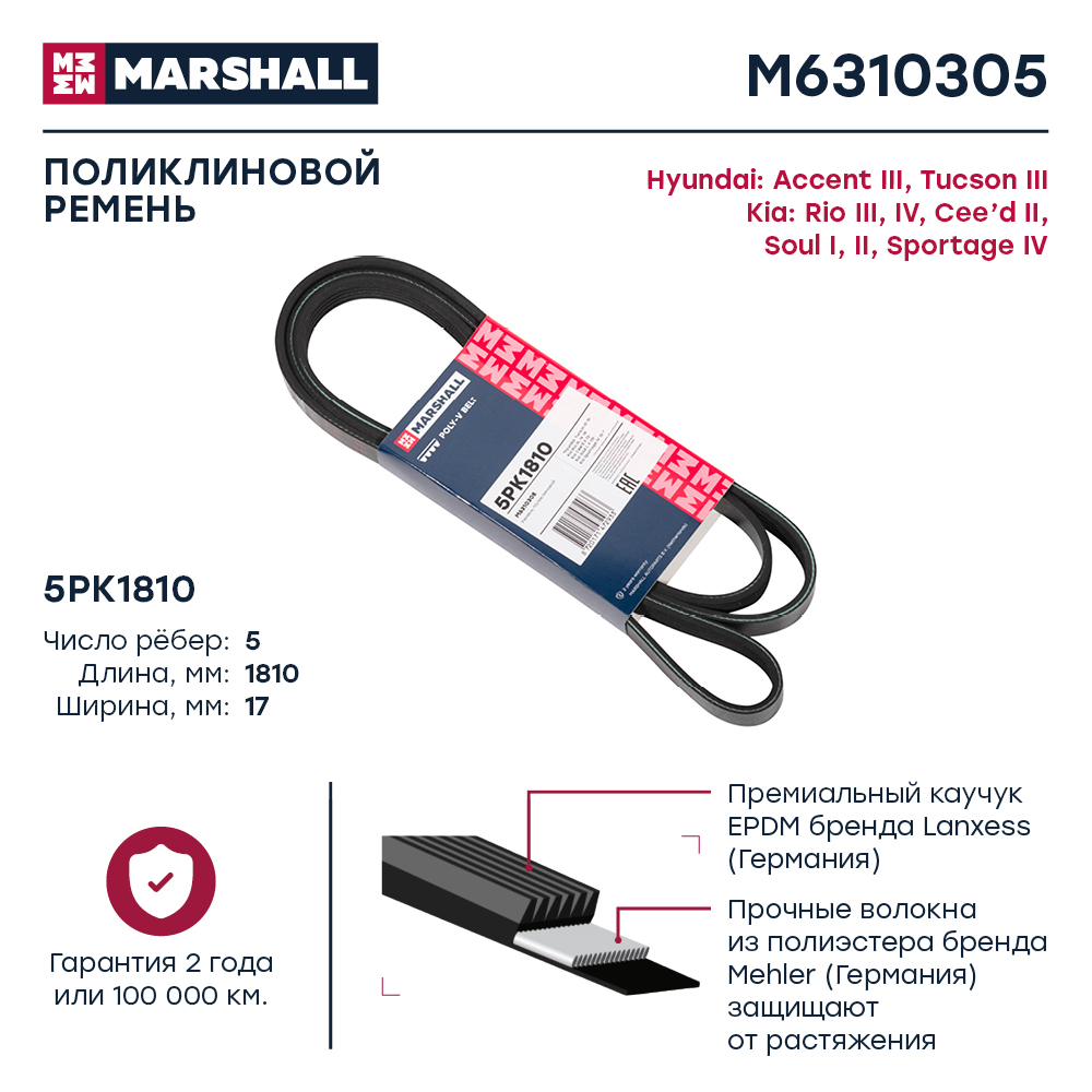 M6310305 MARSHALL Ремень поликлиновой 5PK1810 Hyundai Tucson III 15- Kia Rio III IV 14- Sportage
