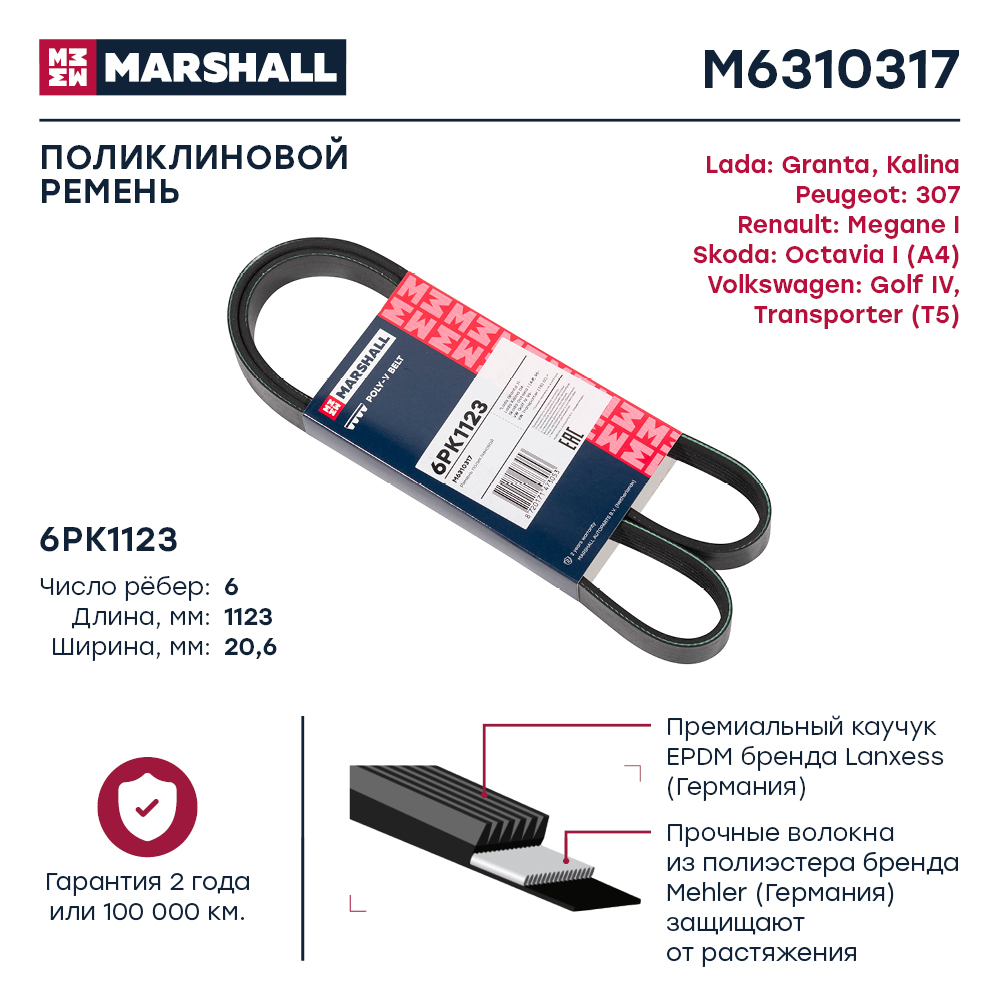M6310317 MARSHALL Ремень поликлиновой 6PK1123 Lada Granta 11- Kalina 04- Skoda Octavia I A4 96- V
