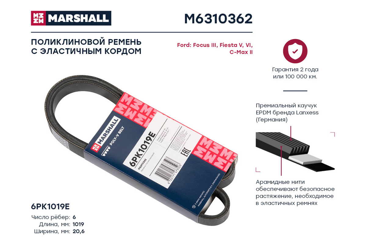 M6310362 MARSHALL Ремень поликлиновой 6PK1019E Ford Focus III 10- Fiesta V VI 01- C-Max II 10- M