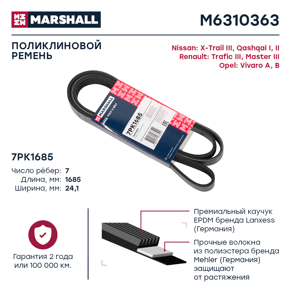 M6310363 MARSHALL Ремень поликлиновой 7PK1685 Nissan X-Trail III 14- Qashqai I II 07- Renault Mas