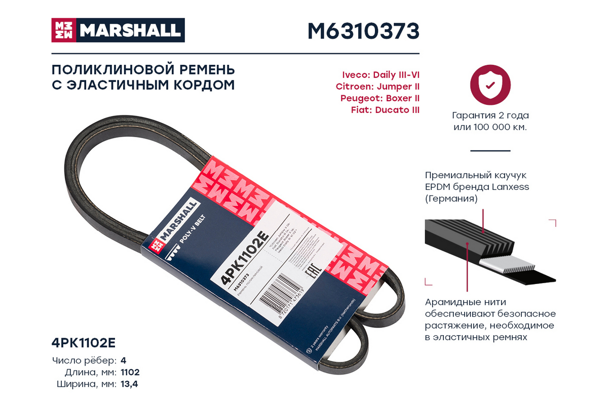 M6310373 MARSHALL Ремень поликлиновой 4PK1102E Citroen Jumper II 06- Fiat Ducato III 06- Peugeot B