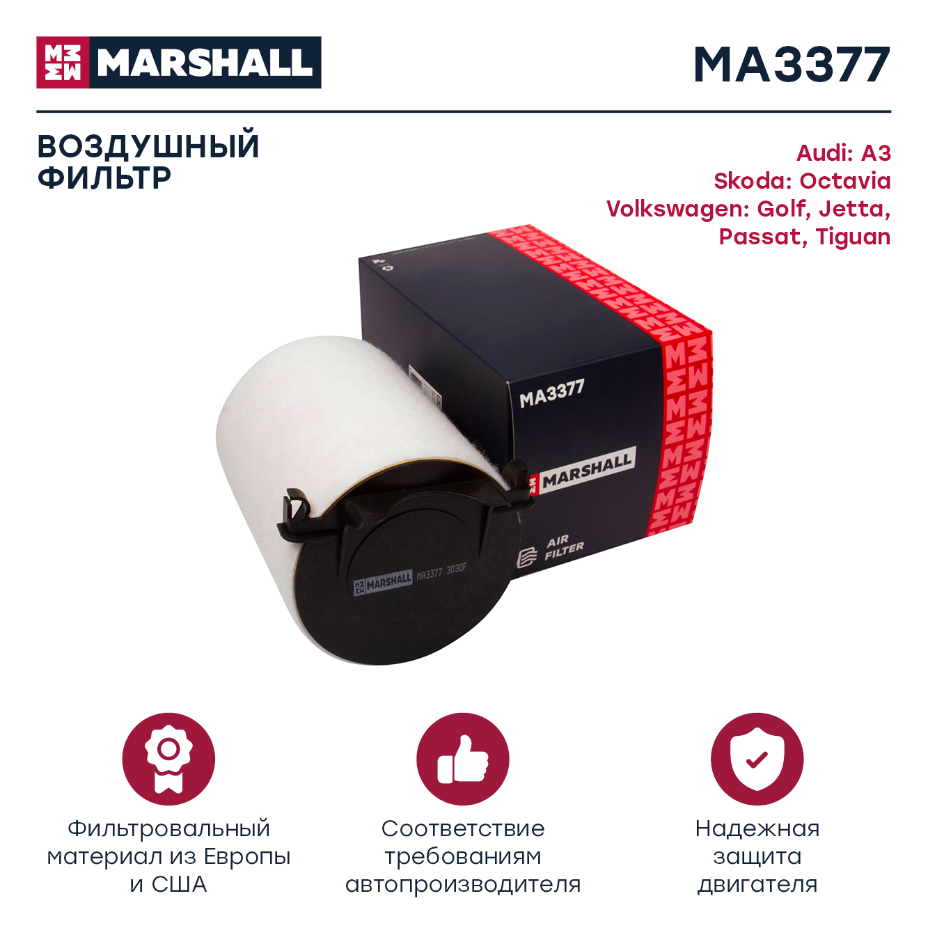 MA3377 MARSHALL Фильтр воздушный Audi A3 8P 03- Skoda Octavia II A5 04- VW Passat B6 B7 05- Tig