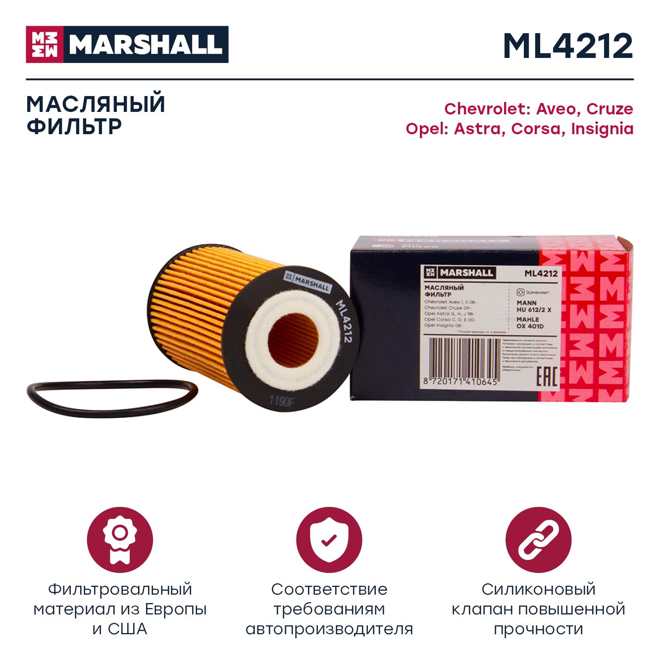 ML4212 MARSHALL Фильтр масляный Chevrolet Aveo I II 02- Cruze I 08- Opel Astra G-J 98- Corsa C