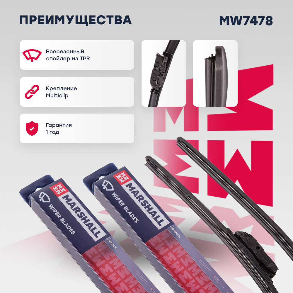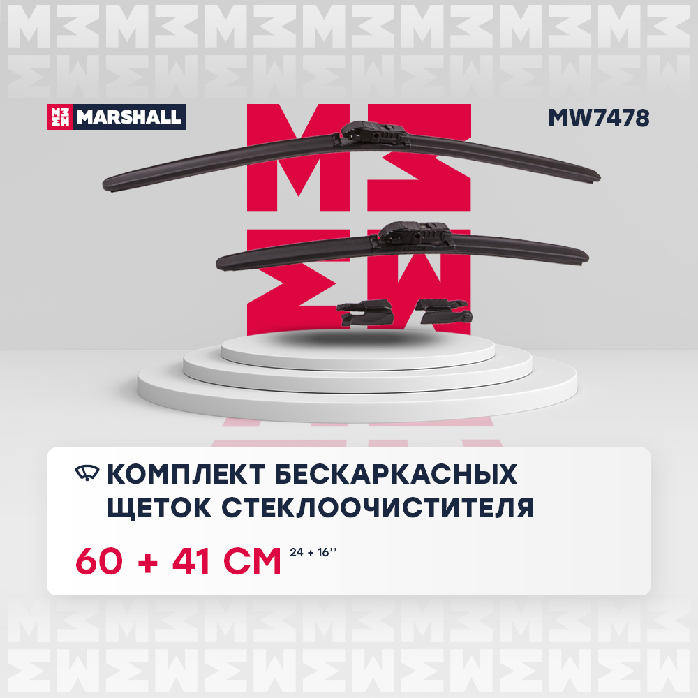 MW7478 MARSHALL Комплект бескаркасных щеток стеклоочистителя 24” 60 см + 16” 41 см hook side