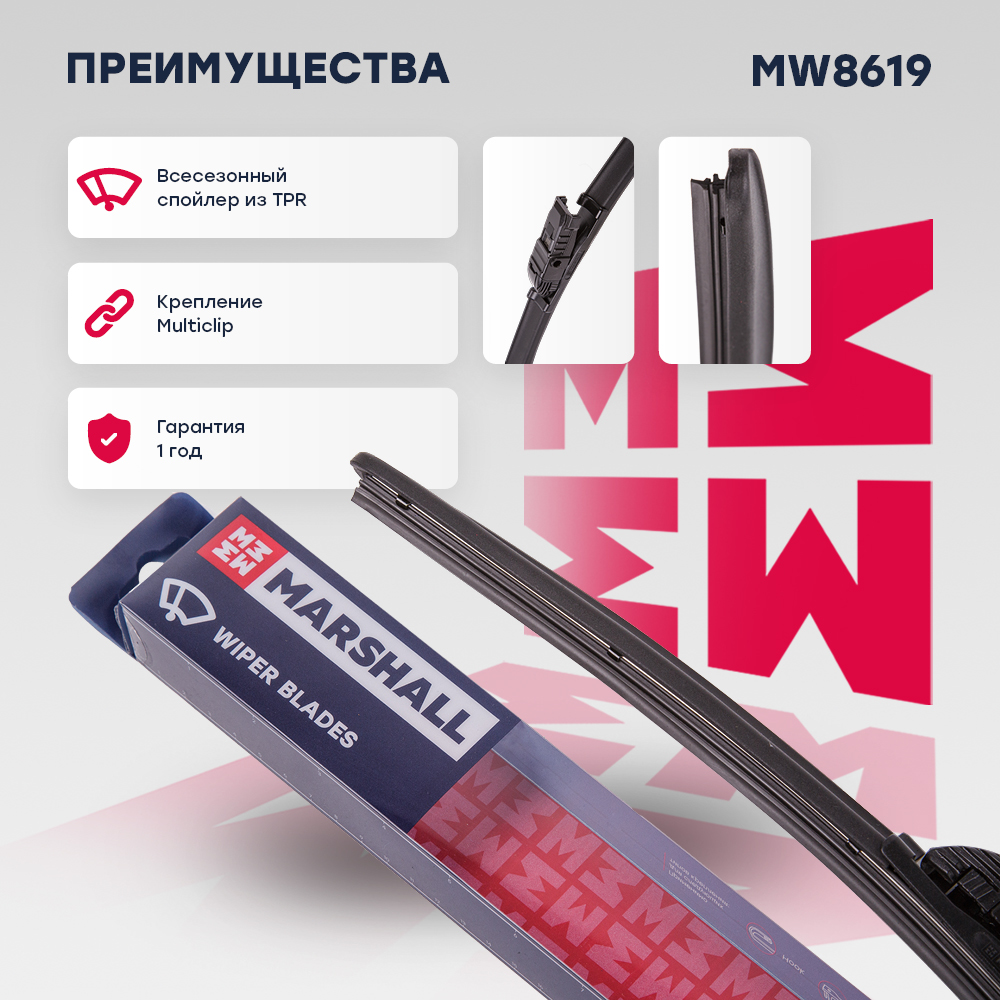MW8619 MARSHALL Щетка стеклоочистителя бескаркасная 18” / 45 см hook, side pin, push/pinch butto